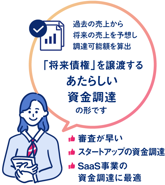 将来の売上(将来債権)を譲渡する資金調達サービスです。現在の売上を基準に「将来の継続性」を考慮して資金調達を受けることが可能です。